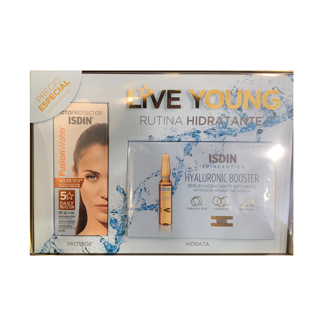 La rutina hidratante Isdin Pack Fusion Water + 5 Ampollas Hyaluronic Booster incluye cinco ampollas de apoyo intensivo para una hidratación profunda y efectiva. El fotoprotector Fusion Water SPF 50+ proporciona una protección solar alta, ideal para el cuidado de la piel en cualquier momento.