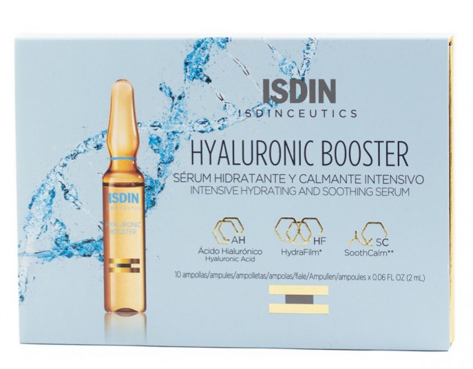 El serum ISDINCEUTICS HYALURONIC BOOSTER está formulado con una combinación exclusiva de moléculas de ácido hialurónico, que captan y retienen la humedad en la piel, ayudando a su hidratación. Además, incluye un péptido con propiedades calmantes que reduce la sensación de sequedad. Es recomendado para pieles que desean mejorar su hidratación. Además, ayuda a mejorar las líneas de expresión y la apariencia cansada del rostro, por lo que también es aconsejado para pieles envejecidas, apagadas y con arrugas.