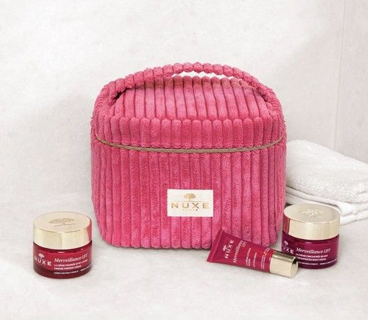 Disfruta de untratamiento lifting completo con el Nuxe Merveillance Lift Neceser, diseñado para corregir arrugas, reafirmar la piel y revitalizar la mirada. Su fórmula enriquecida con aceite de microalga ultra-correctivo proporciona un efecto alisador inmediato y duradero. El neceser incluye: Merveillance Lift Crema en Polvo Efecto Lifting (50ml): Reduce arrugas y reafirma la piel con un acabado empolvado que difumina imperfecciones. Merveillance Lift Crema Concentrada de Noche (50ml): Repara y regenera la piel mientras duermes, dejando un rostro más firme y descansado al despertar. Merveillance Lift Crema Reafirmante Contorno de Ojos (15ml): Reduce bolsas y arrugas, elevando los párpados para una mirada rejuvenecida desde la primera aplicación. Modo de uso: 1. Por la mañana, aplicar la Crema en Polvo sobre el rostro, cuello y escote con movimientos de alisado. Finalizar con suaves toques para estimular la luminosidad. 2. Por la noche, aplicar la Crema Concentrada con un suave masaje, inspirando su aroma relajante para un momento de bienestar antes de dormir. 3. Contorno de Ojos: Con una textura innovadora y un aroma envolvente, este neceser de Nuxe Merveillance Lift es ideal para quienes buscan una piel más firme, lisa y revitalizada.