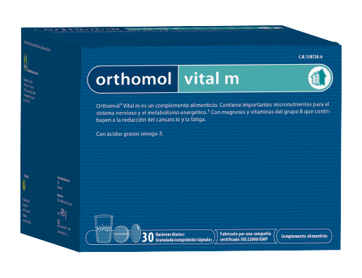 Orthomol Vital M es una fórmula elaborada con micronutrientes que ayuda a reducir el cansancio y la fatiga en hombres. Este complemento alimenticio contiene vitamina C, vitamina B2, vitamina B6, vitamina B12, ácido fólico, yodo, niacina, manganeso y biotina, entre otros componentes, que previenen y combaten el estrés oxidativo del organismo. Esta combinación de micronutrientes está indicada en patologías asociadas al estrés y a la fatiga crónica.
