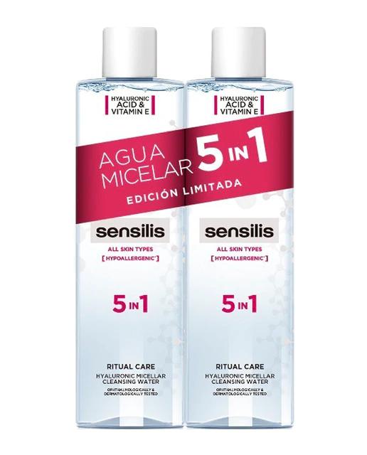 La Sensilis Duplo Agua Micelar limpia, desmaquilla, tonifica, hidrata y calma la piel. Este producto está formulado con Vitamina E y Ácido Hialurónico, ofreciendo múltiples beneficios en un solo uso. Respetuosa con la piel, es hipoalergénica y contiene 0% perfumes, lo que la hace ideal para todo tipo de pieles. El formato incluye 2 frascos de 400 ml. Aplica con un algodón sobre la cara previamente humedecida hasta retirar totalmente el maquillaje. No es necesario aclarar. Uso externo.